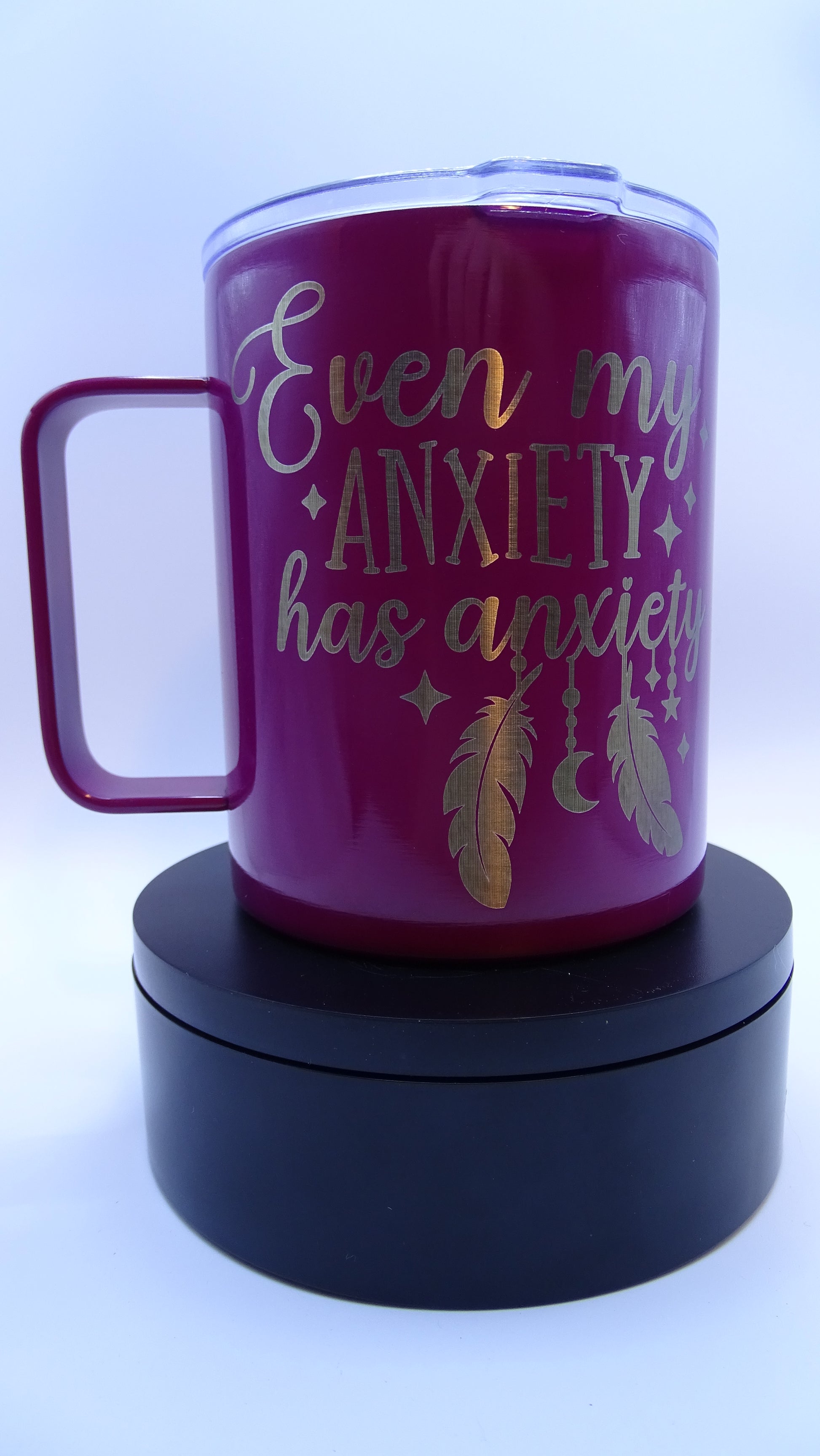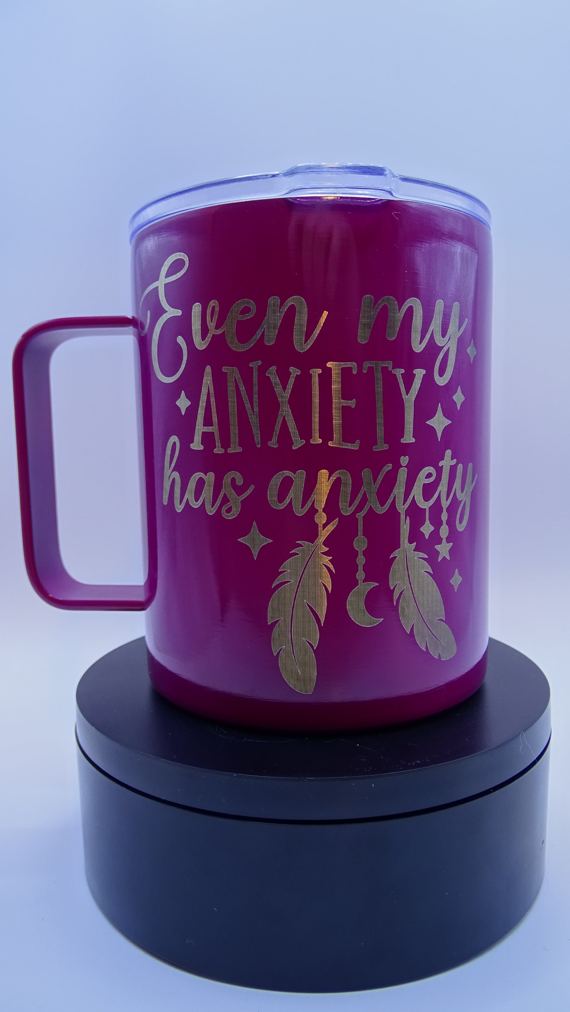 Enjoy your favorite drink in this playful 20 oz purple tumbler-style coffee mug, complete with a convenient handle and lid. Featuring the witty engraving "even my anxiety has anxiety," it’s perfect for anyone who appreciates a little humor with their caffeine fix. Durable and easy to carry, this mug keeps your beverage secure while brightening your day.